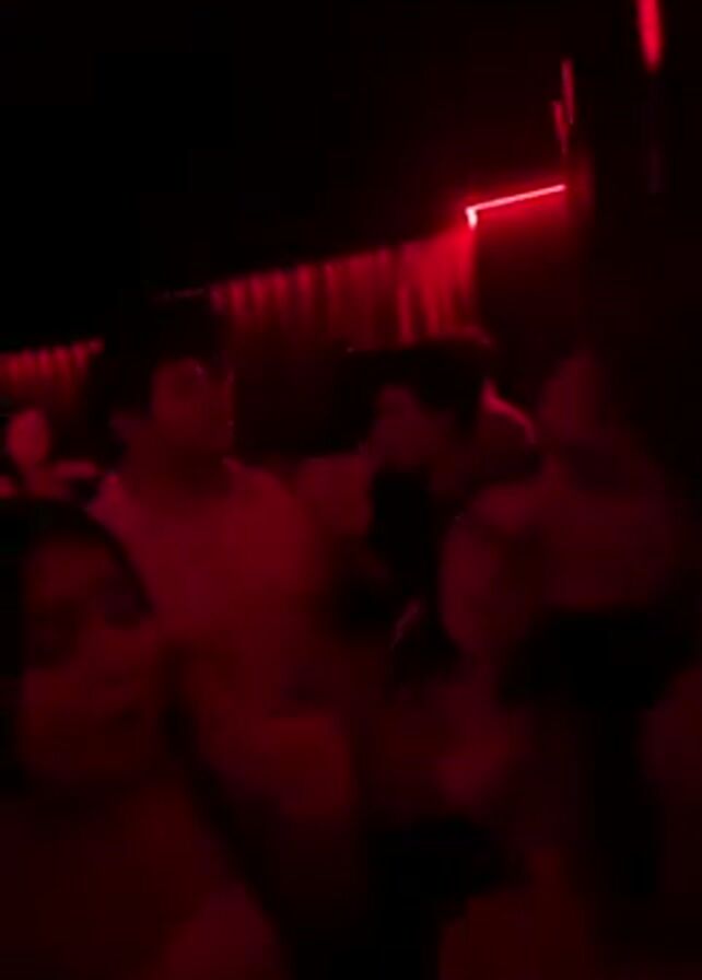 crowded nightclub with red lighting. People are seen dancing and talking. A screen with the words "European summer" is visible in the background. The camera moves through the crowd.