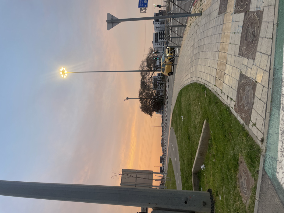 A street scene with a sidewalk composed of square pavers with circular designs. A strip of grass separates the sidewalk from the street. A yellow car is parked on the side of the road. Streetlights illuminate the scene, with the sky featuring a gradient of colors from blue to orange, suggesting either sunset or sunrise. A utility pole anchors the bottom of the frame. Buildings are visible in the distance.