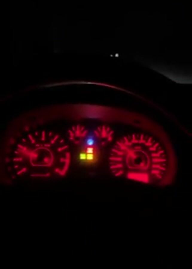The video displays the dashboard of a car in the dark, highlighting the red illumination of the speedometer, tachometer, and other gauges. A blue light and two yellow lights are also illuminated. The camera remains static, focusing solely on the dashboard. There are some exterior lights visible through the front windshield. The primary action consists of the car's dashboard lights being visible in the dark. There are no visible people or interactions beyond the implied operation of the vehicle.