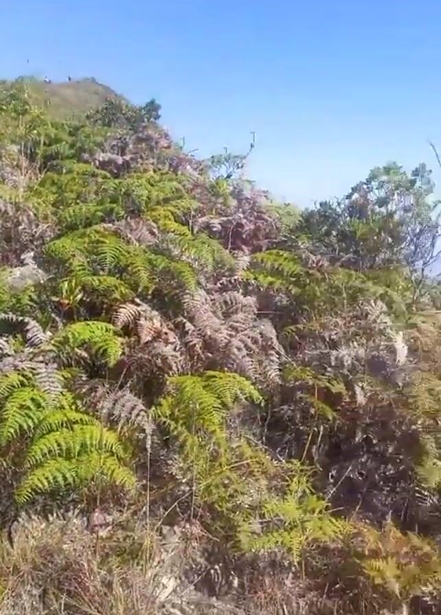 landscape with lush green ferns and other foliage in the foreground and a mountain range in the background. The sky is clear and blue, with some clouds near the horizon. As the camera pans, the view expands to reveal more of the mountain range and a glimpse of a town or city in the distance, possibly by the coast. There are some pink flowers scattered amongst the greenery. The scene appears to be taken from a high vantage point, possibly on a mountain or hillside.