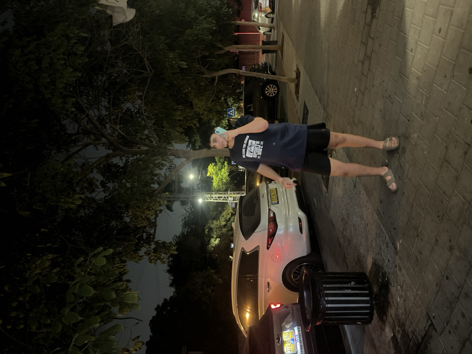 The image displays a nighttime urban scene in Tel Aviv, Israel. A young male, dressed in a dark blue t-shirt with a white graphic, black shorts, and light-colored sandals, stands on a tiled sidewalk. He holds a light blue smartphone to his right ear, appearing to be on a call. To his immediate left is a black slatted metal trash receptacle. Parked on the adjacent street, parallel to the curb, are multiple vehicles. Directly behind the trash can and to the left of the male is a dark grey SUV with the Israeli license plate 370:46-503. Behind it, a white SUV is parked, displaying the Israeli license plate 212:84-701. The scene is illuminated by artificial streetlights, casting light on the pavement and the abundant tree foliage overhead and along the street. A blue square warning sign with a white triangle and an 'A' inside is visible in the mid-ground. The sky is dark, indicating night. Additional parked cars and distant lights are visible further down the street.