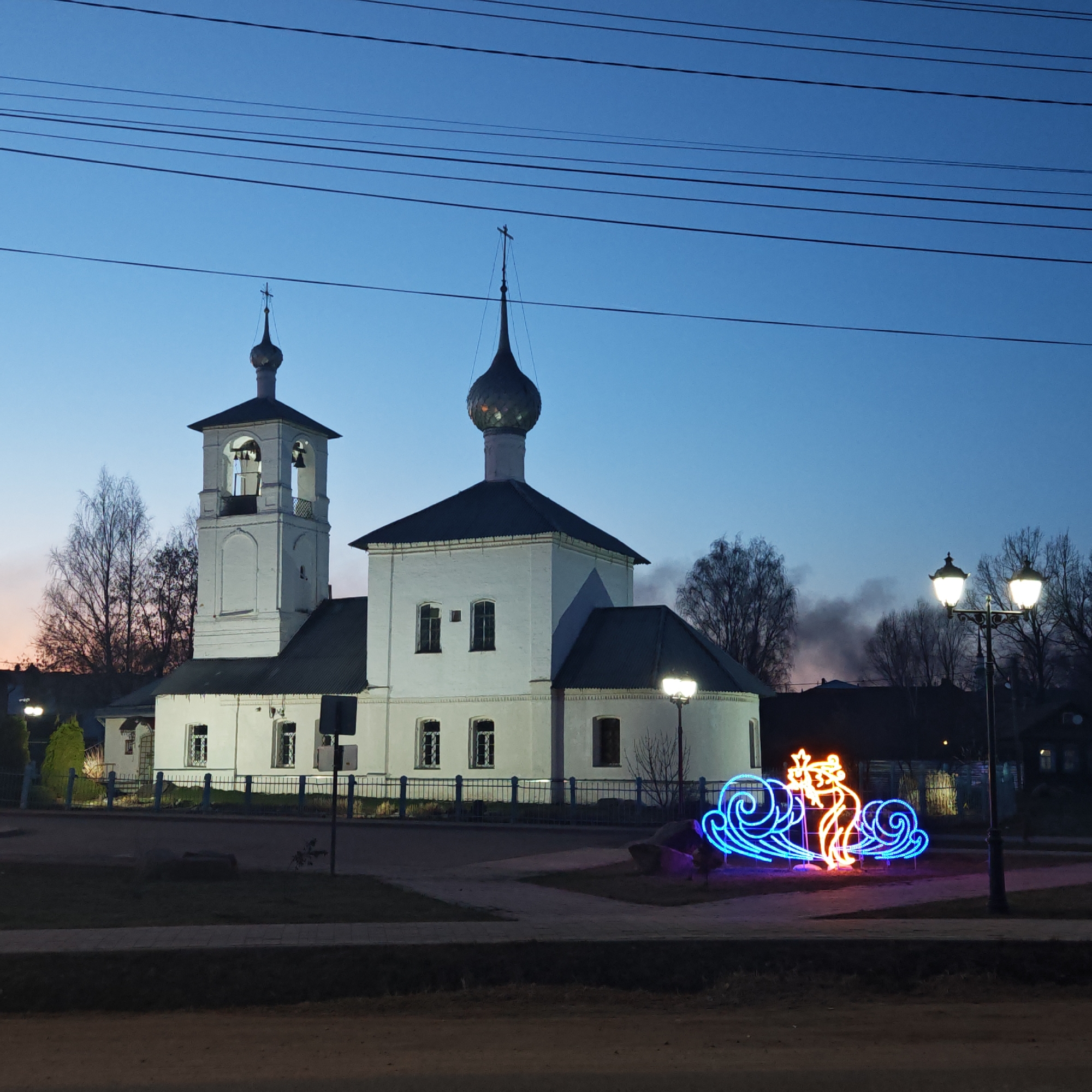 The image captures a serene scene in Kladovitsy, Russia, at twilight. An Orthodox church with white walls, dark roofs, and a bell tower stands prominently. A festive Christmas light display featuring a bear in a sleigh is visible to the right of the church, in front of a set of streetlight lamps. Bare trees dot the landscape, and electrical wires crisscross the sky. The scene suggests a quiet, possibly rural area, with elements of both historical architecture and modern holiday decor. Smoke is coming from a distance behind the church.