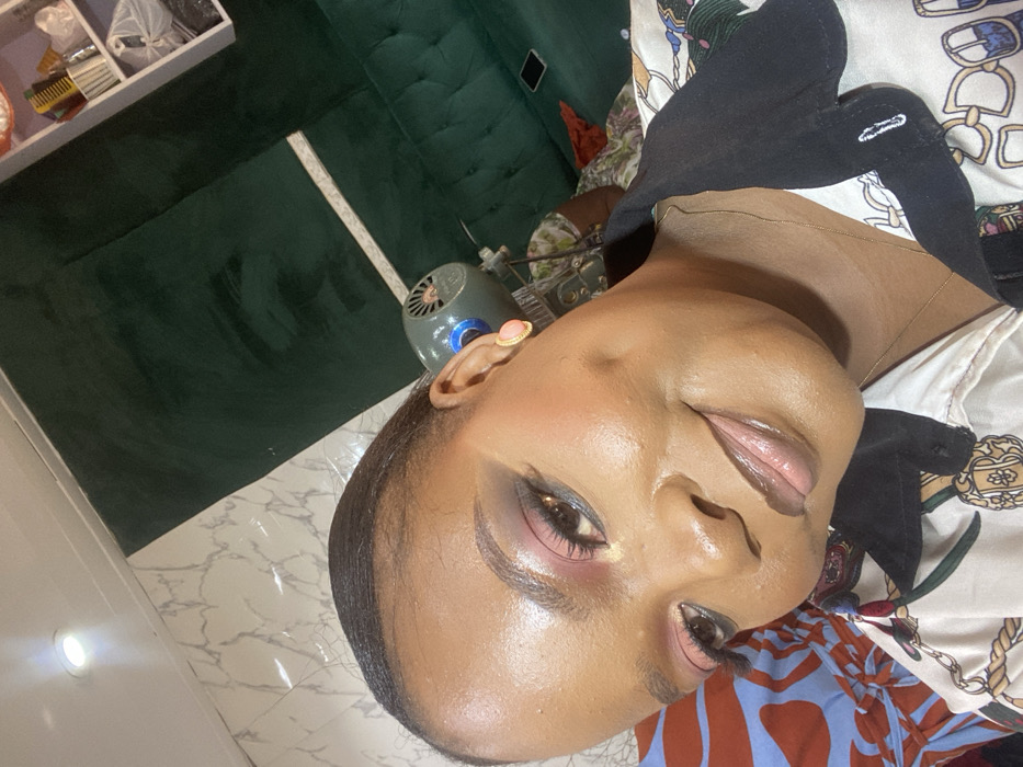 An indoor scene in Nyanya, Nigeria, captures a close-up of a female individual posing for a photograph, likely a selfie, while another person is partially visible in the background. The primary subject, an adult female of color, occupies the majority of the frame, smiling with visible dimples on both cheeks. Her dark hair is pulled back, revealing a clean hairline. She exhibits detailed makeup, including bold eyeshadow transitioning from pink to dark brown or black, prominent eyeliner, and likely false eyelashes. Her eyebrows are well-defined. Her lips are glossy with a light, natural shade. She wears a collared shirt with a black collar and a patterned fabric featuring white, green, and gold chain and crest motifs. A thin gold-colored necklace and a gold-rimmed, salmon-colored oval stud earring are visible on her right ear. The background features a wall partially covered in white marble-patterned tiles on the left and a dark green, possibly velvet or tufted, surface on the right. A recessed ceiling light illuminates the upper left. A grey-green table or desk fan is positioned to the right of the primary subject. On the dark green surface, identified as a couch, a second individual is seated, partially visible from the head and shoulder, wearing a floral or patterned garment. A white smartphone rests on the green couch near this secondary person. In the upper right corner, a white shelf unit is partially visible, containing small items such as combs and containers. A blue and orange patterned textile object is visible in the lower-left corner.