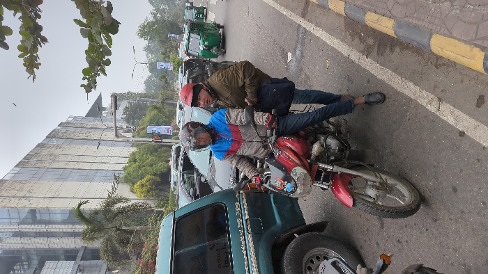 On a busy road, a red motorcycle is stopped amid traffic. The driver, wearing a helmet and blue jacket, is partially obscured by a green tuk-tuk. A second person, also wearing a helmet and brown jacket, leans over the driver. Vehicles surround them. The road is bordered by a sidewalk with yellow and black stripes. In the background, a large building is partially visible, along with trees and advertisements.