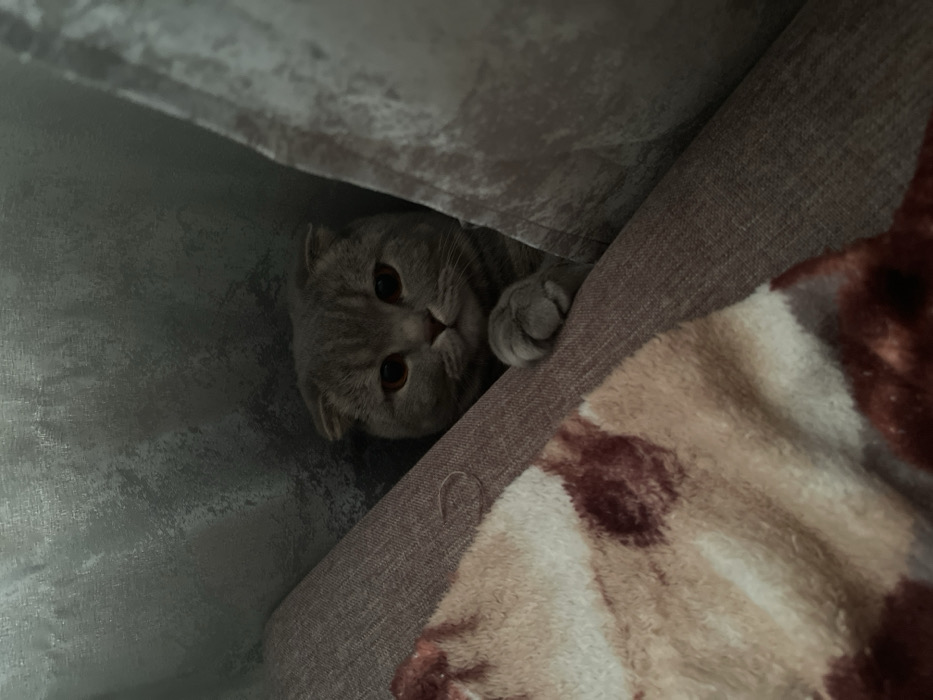 - "The image displays a Scottish Fold cat peeking from behind a light-colored curtain in a dimly lit indoor setting, presumably in Chaikovsky, Russia" by FM-GY7T12, licensed under CC BY 4.0