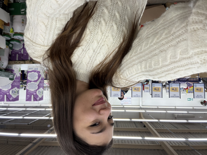 A woman poses in a grocery store aisle, surrounded by shelves of products. Several containers of JOYA coconut milk are visible on the left side of the image, along with other groceries. The woman is wearing a cream-colored, knitted sweater. Price tags hang from the ceiling, displaying numbers like "66,1" and "66,5". The image appears to have been taken with a slightly off-center, upside-down orientation.