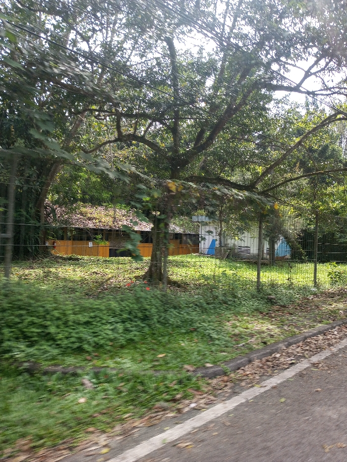 The image captures an outdoor scene in the city of Namthoung, Laos, from a roadside perspective. In the foreground, a dark asphalt road surface with a partial white line on its right edge transitions to a concrete curb. Scattered dry leaves are present on the road shoulder and curb. Immediately beyond the curb, a strip of bright green grass and low-lying foliage extends towards a metal fence that runs horizontally across the midground. Several large trees with dark, gnarled trunks and dense green canopies are visible, primarily inside the fenced area and overhead, with bright sunlight filtering through their leaves. Behind the fence, to the left, a long, single-story building with a dark, possibly thatched or tiled, roof is partially visible. Its facade is a consistent orange-brown or yellowish-brown, suggesting wooden construction or paneling, with multiple darker rectangular openings or windows. To the right of this structure, a lighter-colored, utilitarian building, possibly white or light gray, features distinct blue geometric shapes (a triangle and another irregular shape) painted on its visible side. The ground within the fenced area is covered in light green grass, with small red elements (possibly flowers) near the base of a prominent tree. No individuals or specific actions are visible within the scene.
