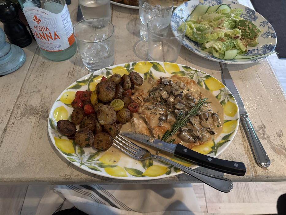 The image depicts an indoor dining scene, presumably located in Miami Beach, United States. A light-colored, possibly distressed wooden table serves as the primary surface. Centrally positioned is a large oval ceramic platter featuring a yellow lemon and white flower pattern. The platter holds two portions of light-colored meat, likely chicken, covered in a creamy mushroom sauce and garnished with a single sprig of fresh rosemary. Alongside the meat are roasted small potatoes mixed with red and yellow cherry tomatoes. A metal fork and a black-handled metal knife are placed on the left side of this platter. To the right, a smaller oval ceramic plate, adorned with a blue and white decorative pattern, contains a green salad comprised of lettuce, sliced cucumbers, and seeds, coated in a light dressing. In the upper right quadrant, an "Acqua Panna" natural spring water bottle is visible, accompanied by two clear glasses containing ice cubes. A striped fabric item, possibly a napkin or towel, in white and dark stripes, is partially visible on the far left. No people or specific actions are depicted.