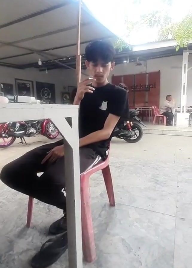 A young man is sitting on a red plastic stool outside a building with a corrugated metal roof. He is wearing a black t-shirt with a small graphic, black pants with a white stripe, and black sandals. He has dark hair and is holding a lit cigarette to his mouth, appearing to smoke it. There is a white table to his left with a white umbrella on top of it. In the background, there are two motorcycles parked and another man sitting at a table in the building. A sign that reads "laki kopi" is visible above the man in the background. The floor is tiled with a light gray pattern. The sunlight is very bright, creating a glare in the upper part of the frame.