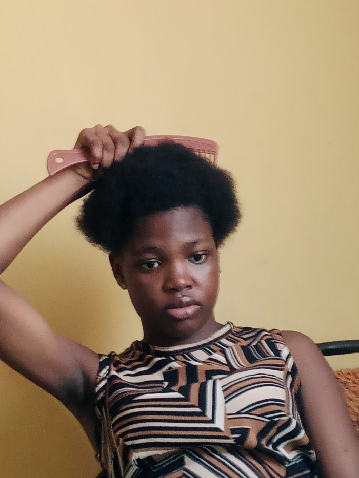 A young, dark-skinned woman poses indoors against a light yellow wall. Her hair is short, dark, and styled in an afro. She holds a pink comb above her head as if she's about to comb her hair. She wears a sleeveless top with a geometric pattern in shades of brown, beige, and white. The woman gazes towards the camera with a slightly melancholic expression. The background appears to be a simple room setting.
