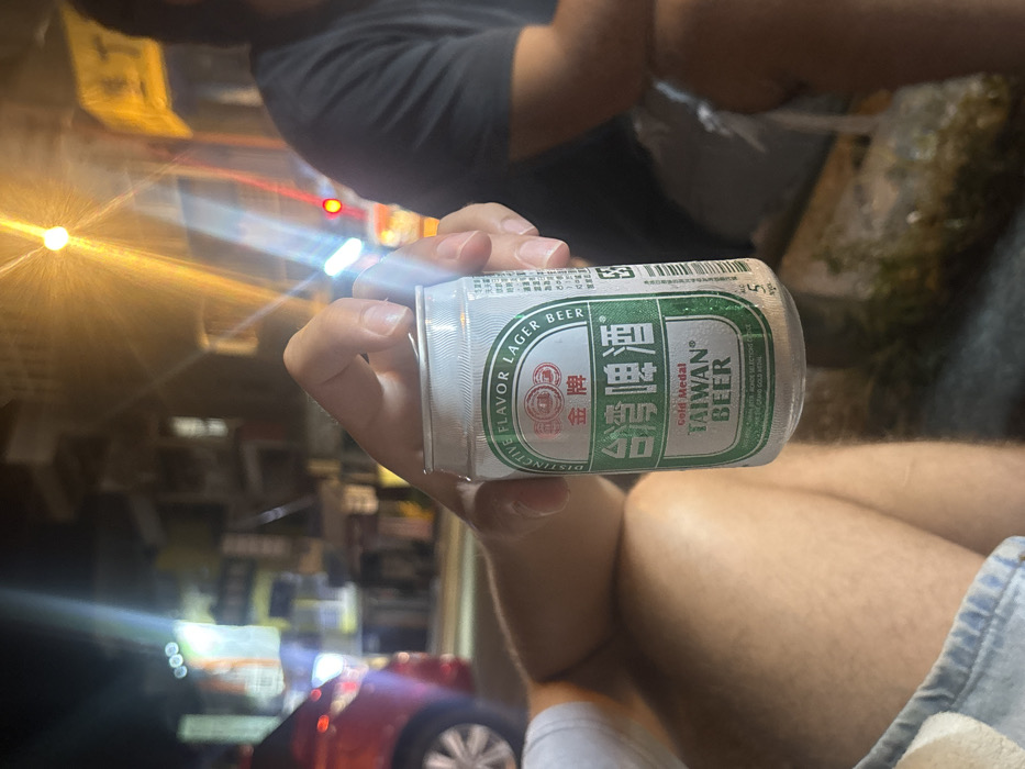 An image taken at night in the city of Hengchun, Taiwan, features a person's right hand prominently holding a chilled silver can of Taiwan Beer