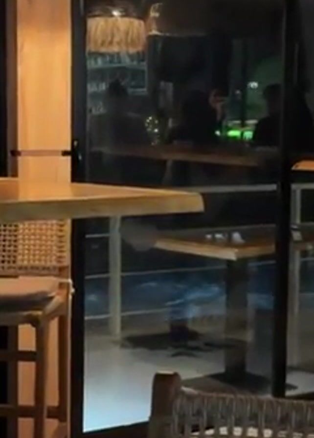 The interior of a restaurant is viewed through a large window. The restaurant has a beachy, tiki hut aesthetic with thatched light fixtures and wicker furniture. Inside the restaurant, there are people sitting at tables. Outside, it is dark, and the ocean can be seen with turbulent waves. The camera focuses on the waves through the window. The overall lighting in the scene is dim and warm. A song is playing in the background.