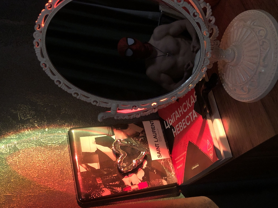 A white, ornate mirror reflects a muscular figure in a Spider-Man mask. Below, a glossy box with a silver, heart-shaped object rests atop a magazine featuring a Saint Laurent label. Next to it, a book titled "Цыганская Невеста" (Gypsy Bride) is positioned. The scene is bathed in sunlight, creating vibrant red and green hues across the surfaces.