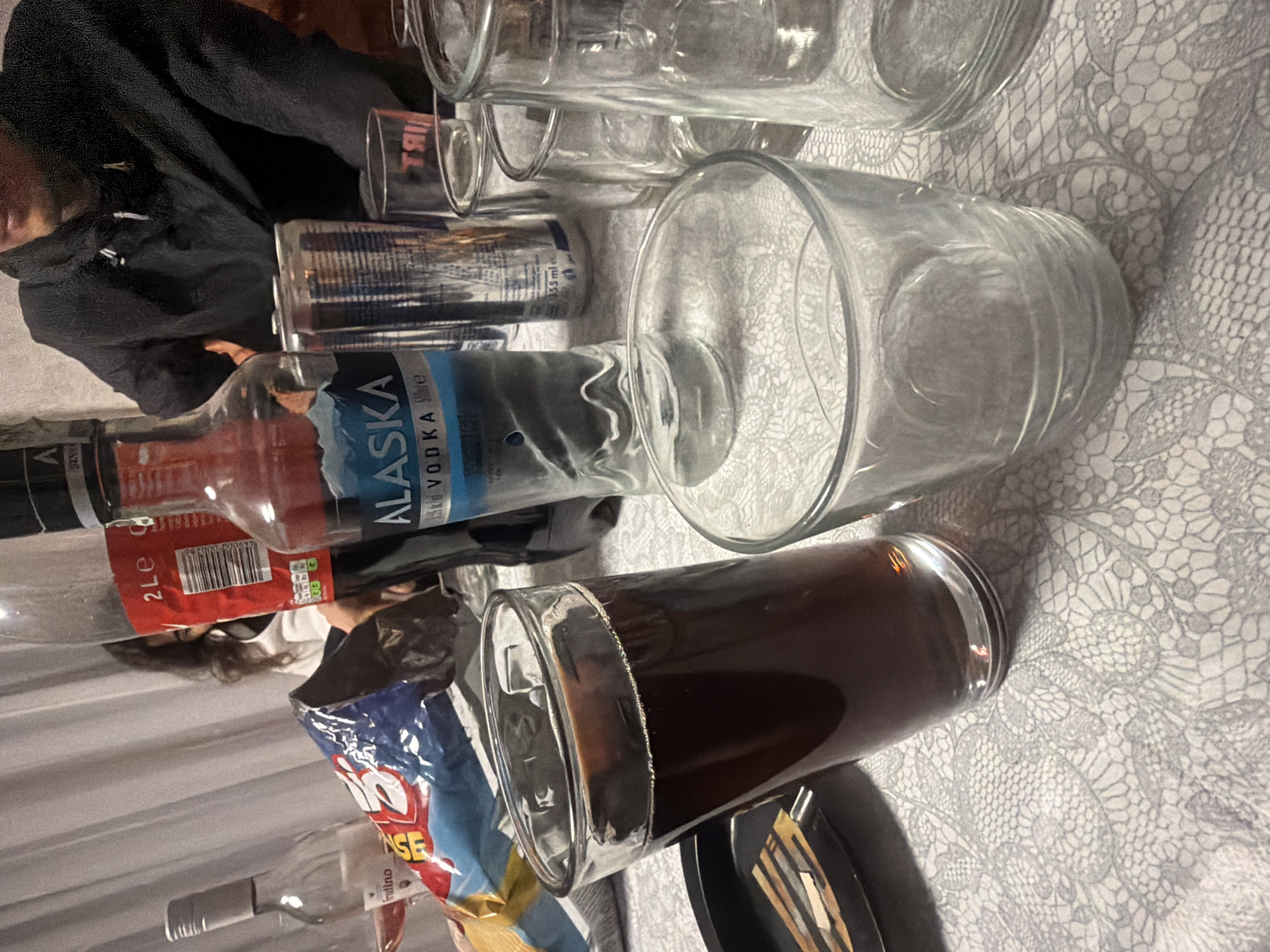 The image depicts an indoor social gathering taking place on a table in the city of Kazichene, Bulgaria. The table is covered with a light-colored tablecloth featuring a repeating lace-like pattern. Visible individuals include: * A person with dark, curly hair wearing a light-colored top, partially obscured by a Coca-Cola bottle on the left side of the frame. * A second person wearing a dark hooded garment, partially visible on the right side of the frame, with only the lower portion of their face and upper torso discernible. Objects on the table, from left to right: * A partially consumed clear glass bottle of "frullino" white wine. * An open blue and yellow bag of chips, with text partially visible. * An almost empty 2-liter plastic bottle of Coca-Cola, with a red label showing "2 LE" and a barcode. * A partially consumed clear glass bottle of "ALASKA VODKA" with a blue label. * A silver-colored beverage can with blue accents, marked "355 ml," positioned behind the vodka bottle. * A black rectangular tray or ashtray containing several discarded cigarette butts or similar objects. * One tall, clear glass filled approximately three-quarters with a dark brown carbonated liquid, exhibiting some foam at the surface. * Several empty, clear drinking glasses of various sizes are scattered across the table. One small, empty glass is in the foreground, and several more are visible further back. The scene suggests recent or ongoing consumption of beverages and snacks in a relaxed setting.
