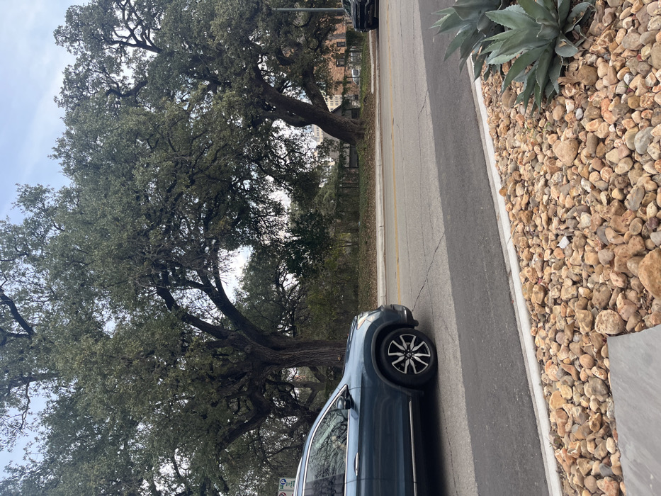 A street scene includes a dark-colored car parked next to a sidewalk covered in tan rocks. A large agave plant sits in the upper right. Across the street are large trees with extensive branching, partially obscuring buildings in the background. The sky is visible between the branches. The road is paved with asphalt and has a double yellow line.