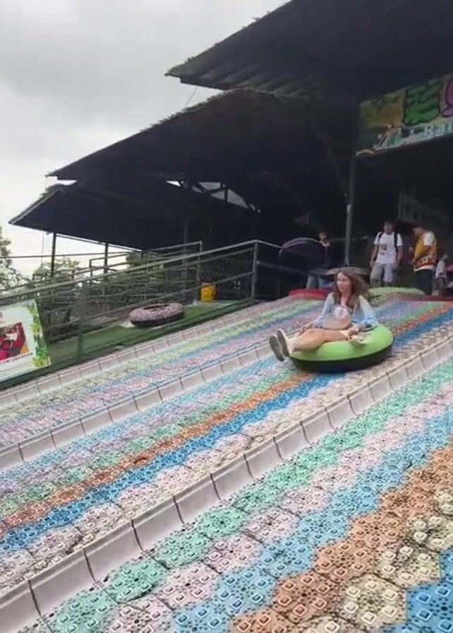 A woman is sliding down a long, colorful slide on an inflatable tube. The slide is made of many small patterned tiles and is positioned on a hillside. There is a structure at the top of the slide with a sign in a foreign language, and several people can be seen standing near the top. As the woman slides down, the camera pans to show the landscape surrounding the slide, including trees, hills, and some buildings in the distance. The sky is cloudy with patches of blue. A tall, bare tree stands beside the slide.