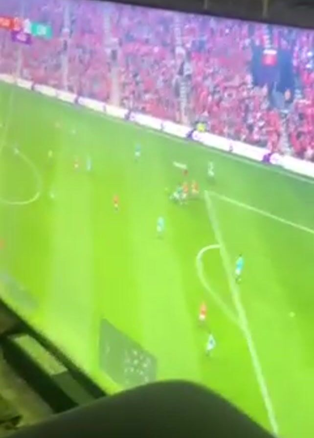 television screen displaying a FIFA soccer game. The score is Manchester United 1, Liverpool 1. Players are in red and light blue. The environment appears to be a living room with a dark gray brick wall. A gray couch is partially visible in the foreground.