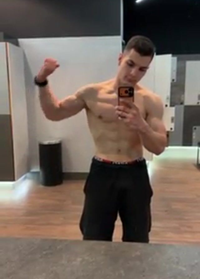 A shirtless man wearing black athletic shorts is standing in front of a mirror in what appears to be a gym locker room
