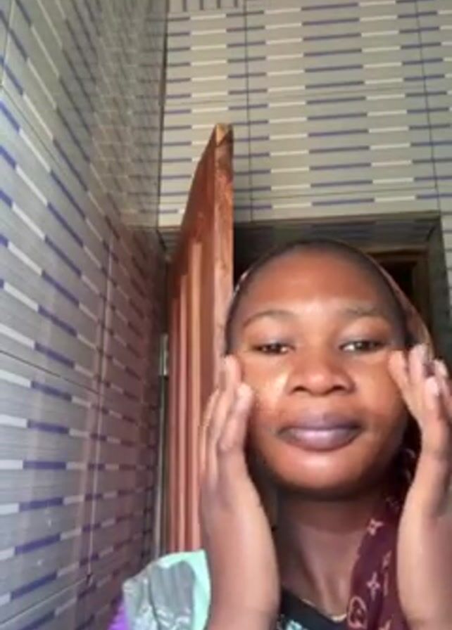 The video features a woman with dark skin and dark hair slicked back with a brown and tan scarf standing in a bathroom