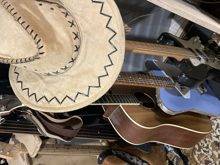 The image displays a cluttered indoor scene featuring musical instruments and a cowboy hat