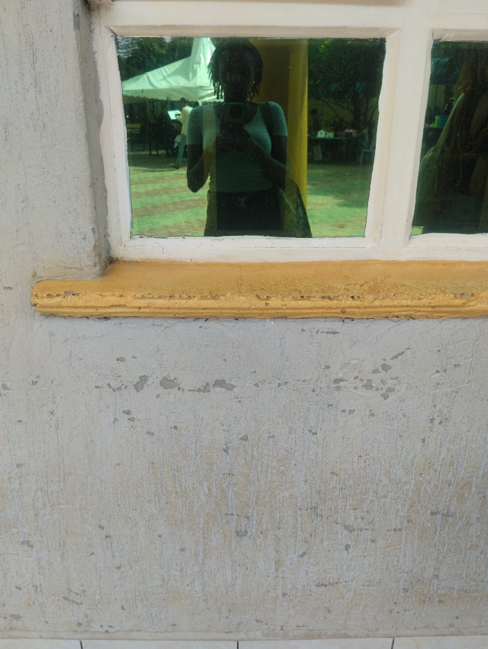 The image displays a distressed, light-colored wall with peeling paint and texture occupying the lower portion, capped by a yellow ledge. Above this is a white-framed window with multiple green-tinted panes. The left window pane reflects a dark-skinned individual with dreadlocks, holding a dark smartphone to capture their own image, a selfie. They are wearing a light-colored, short-sleeved top and dark bottoms; a dark bag or strap is visible on their right side. Through the tinted window, an outdoor scene is visible, featuring a large white tent structure with a pointed roof, several indistinct figures, and what appear to be tables and chairs, indicating an outdoor gathering. Green foliage is visible in the background, and the ground appears unpaved. The location is a hospital ward in Kenya.
