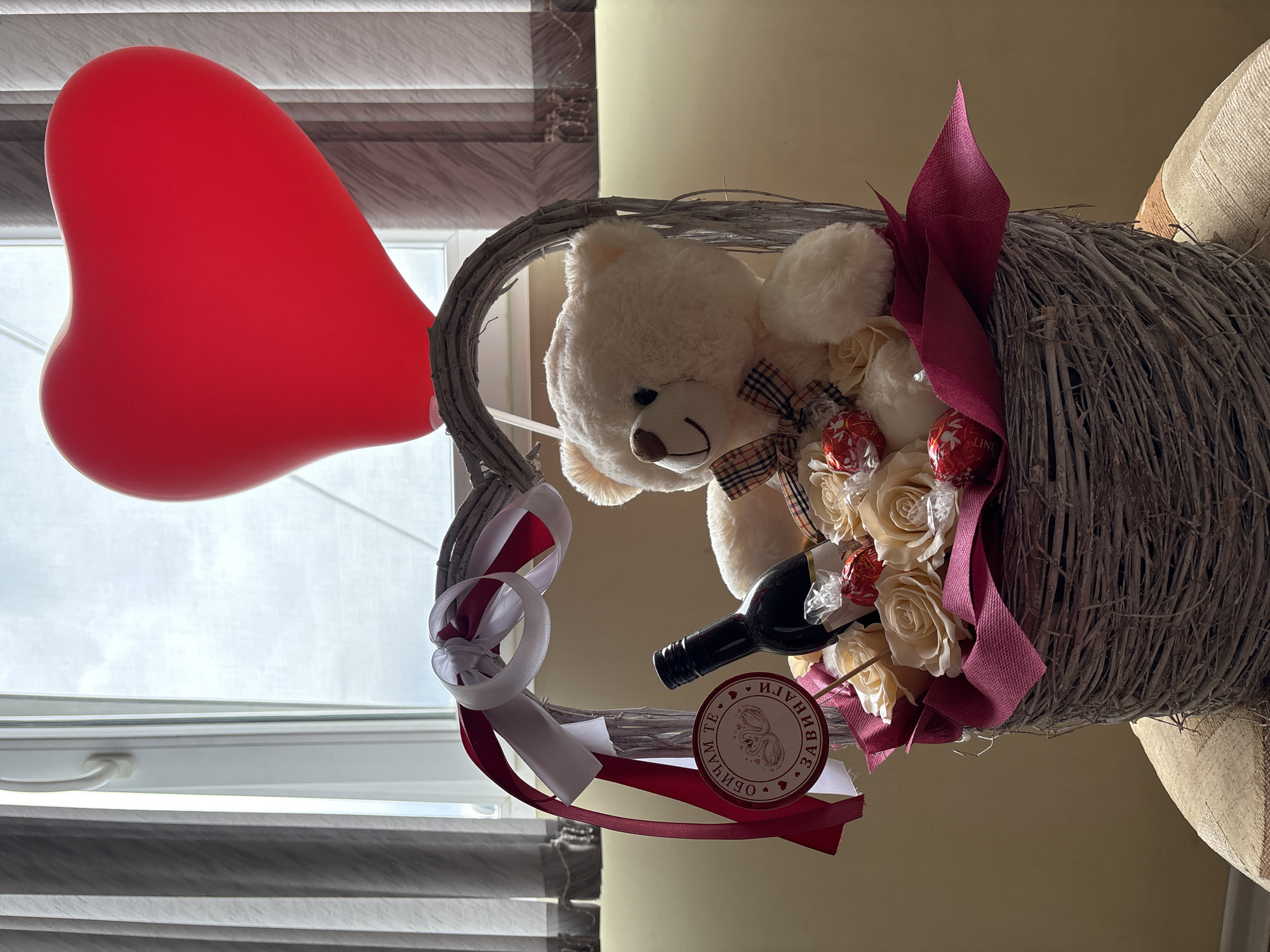 A gift basket featuring a white teddy bear, flowers, chocolates, a small bottle of wine, and a heart-shaped red balloon sits near a window. The basket is made of interwoven twigs. A round label with a picture of two swans and text in Cyrillic is attached to the wine bottle. Red and white ribbons are also present. The window shows an overcast sky and the corner of the window frame. The image was taken in Sliven, Bulgaria.