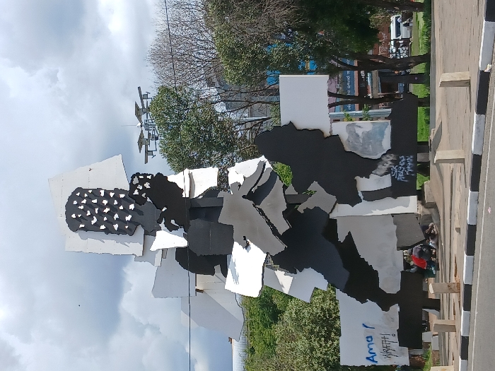 A tall, abstract sculpture stands outdoors. It's constructed from multiple layers of black, white, and gray painted pieces forming an irregular shape. The sculpture sits beside a paved area with a curb. Trees, a street, and parked vehicles appear in the background under a cloudy sky. Graffiti is visible on some of the sculpture's components.
