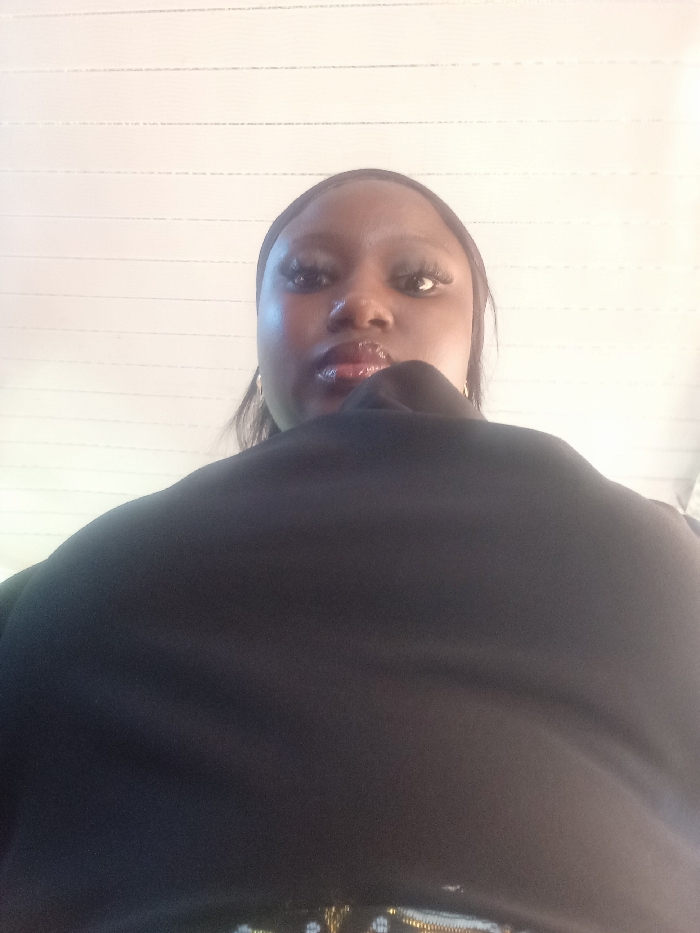 The image displays a single individual, a young adult female, positioned indoors. She has dark skin, is wearing a dark headband, and exhibits prominent eyelashes and glossy lips. She is clad in a dark-colored garment, likely black, covering the majority of her torso. A faint, decorative pattern with gold and blue/white elements is visible at the lower edge of the frame, underneath the dark garment. The individual is looking directly into the camera. The background consists of a light-colored, horizontally paneled surface, consistent with an interior wall or ceiling. Illumination appears to be from a source above or in front of the subject. This scene is identified as taking place on Rukuba Road, Nigeria.