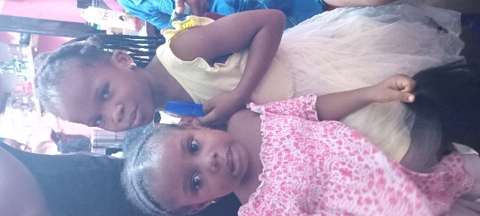 Two young girls are the focal point of the image. The girl on the top left is wearing a yellow dress. She has cornrow braided hair and is holding a blue comb. The girl on the bottom right is wearing a pink floral dress. Both girls are looking at the camera. The picture appears to be taken indoors, with shelves and items visible in the background.