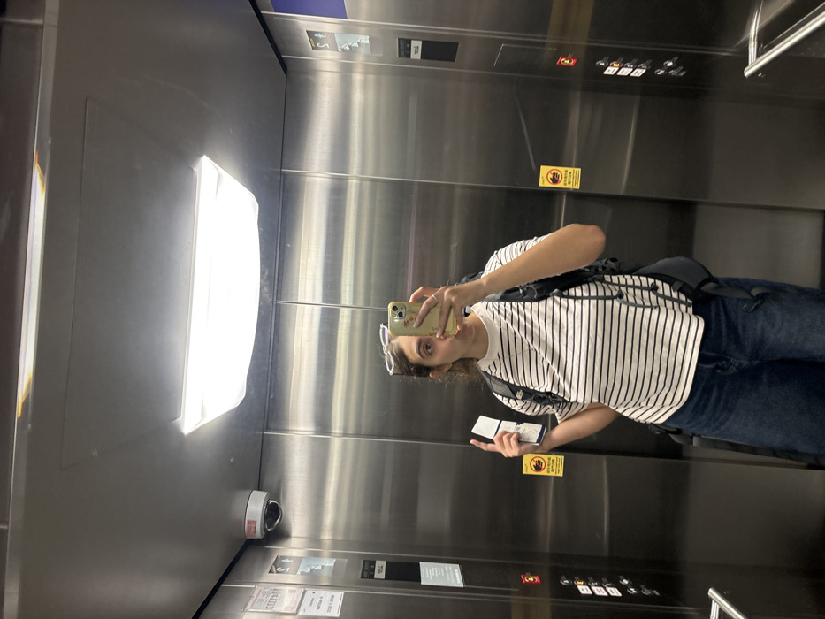 A person stands in an elevator, taking a selfie with their phone. The elevator interior is stainless steel, with a bright, rectangular light fixture overhead. Control panels and signage are visible. The individual is wearing a striped shirt, jeans, and a backpack. They are holding a phone in one hand and what appears to be a card or small object in the other. A security camera is mounted in the upper left corner. The image is slightly rotated.