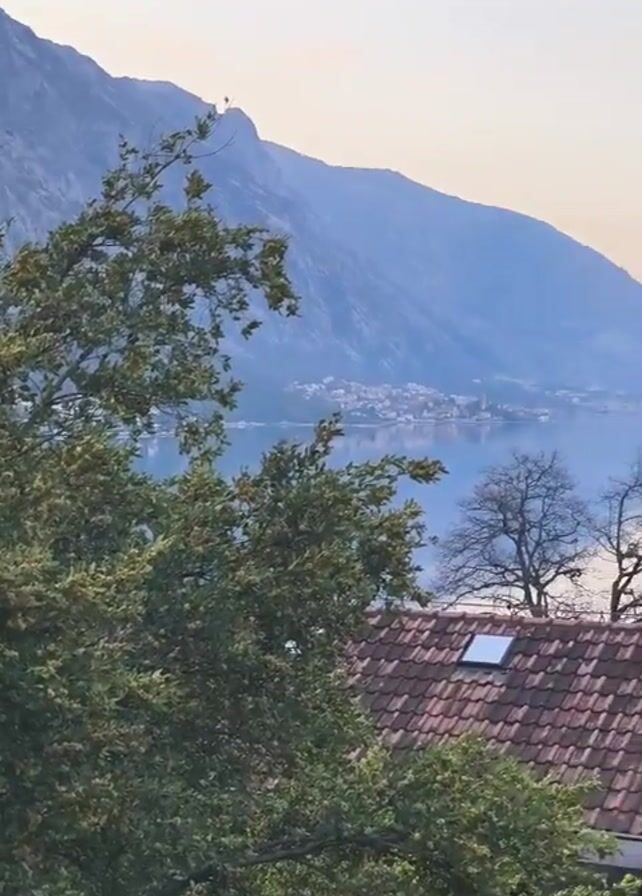 A static, medium shot of a landscape featuring mountains and a body of water. In the foreground, the focus is on the red-tiled roof of a building with two skylights. A tree with green leaves is visible on the left side of the frame, partially obscuring the view. A few leafless trees are to the right of the roof. Beyond the roof, there is a bay or lake with calm water that reflects the sky. In the distance, there are mountains covered in vegetation. The sky is clear with some light clouds, suggesting either dawn or dusk. A bird briefly flies into frame and then out.