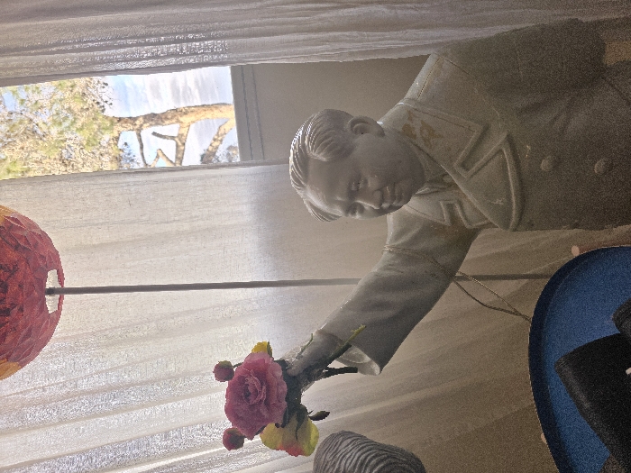 A statue of a man in a military uniform is angled to the right. The statue's arm reaches towards a flower. A red and yellow globe-like object is visible on the left. A tree branch is visible through a window in the background. A blue surface is seen on the right side. The image has a washed-out color scheme.