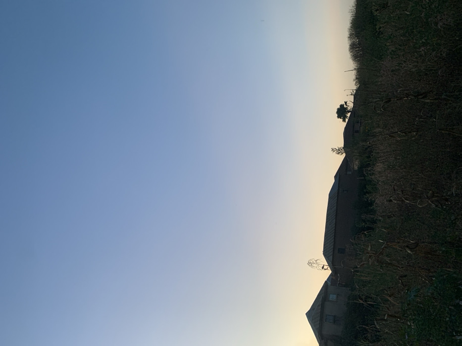 The image displays a twilight scene, likely either dawn or dusk, within a residential area of Jos, Nigeria. The foreground, occupying the lower third of the frame, consists of dense, dry, brownish vegetation, possibly maize stalks, interspersed with dark green shrubs. Above this vegetation, a cluster of single-story residential buildings with dark roofs and varying wall tones are visible. The leftmost visible structure has light-colored walls and a sloped roof. A longer, rectangular building with dark walls and roof is situated towards the center. Further to the right, additional structures and trees, including a distinct palm-like silhouette, are partially obscured. The sky, filling the upper two-thirds of the image, exhibits a clear gradient, transitioning from a light blue overhead to a pale yellow and orange band along the horizon. No human or animal subjects are present.