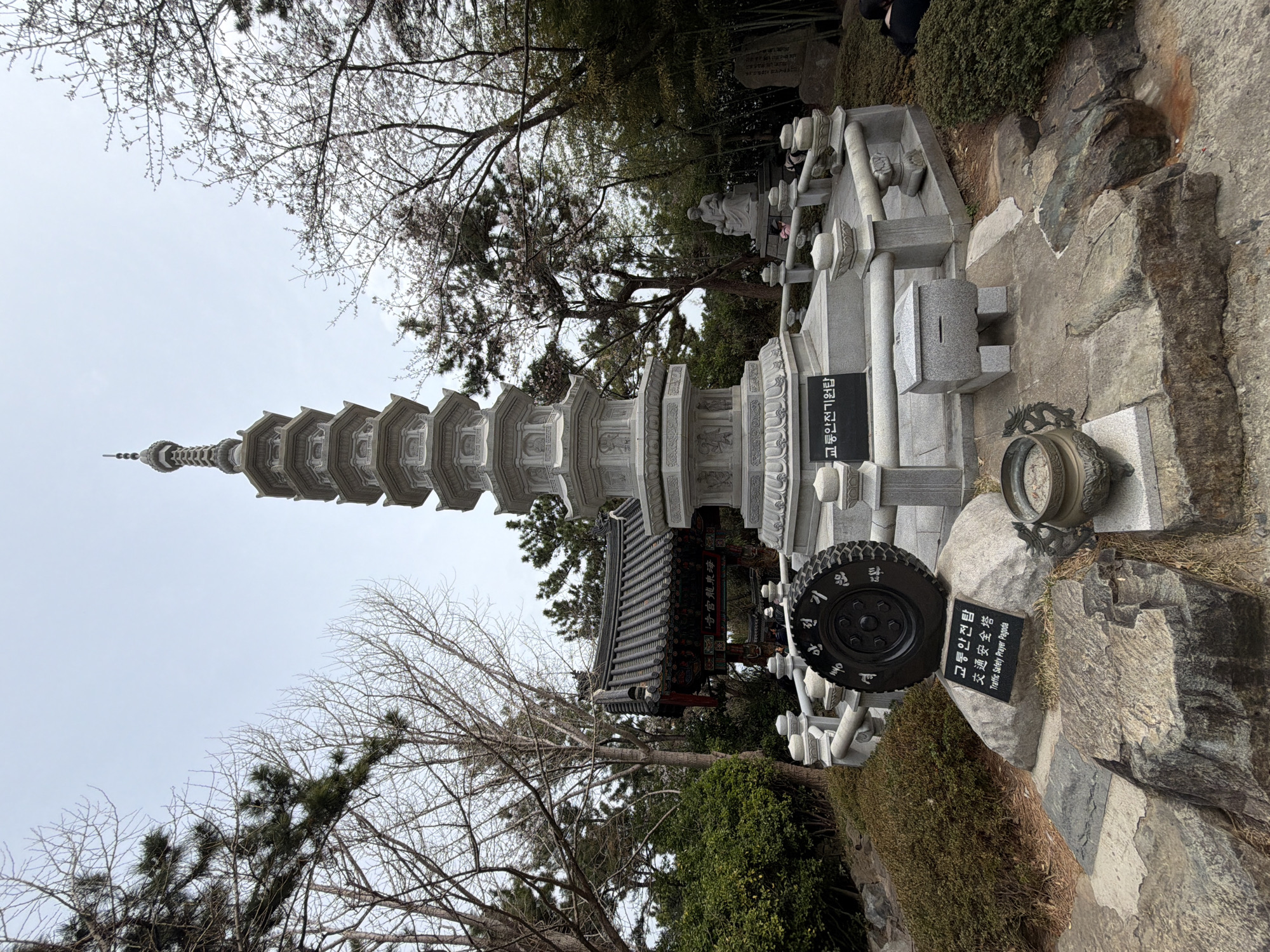 The image captures a tall, intricately carved stone pagoda in Busan, South Korea