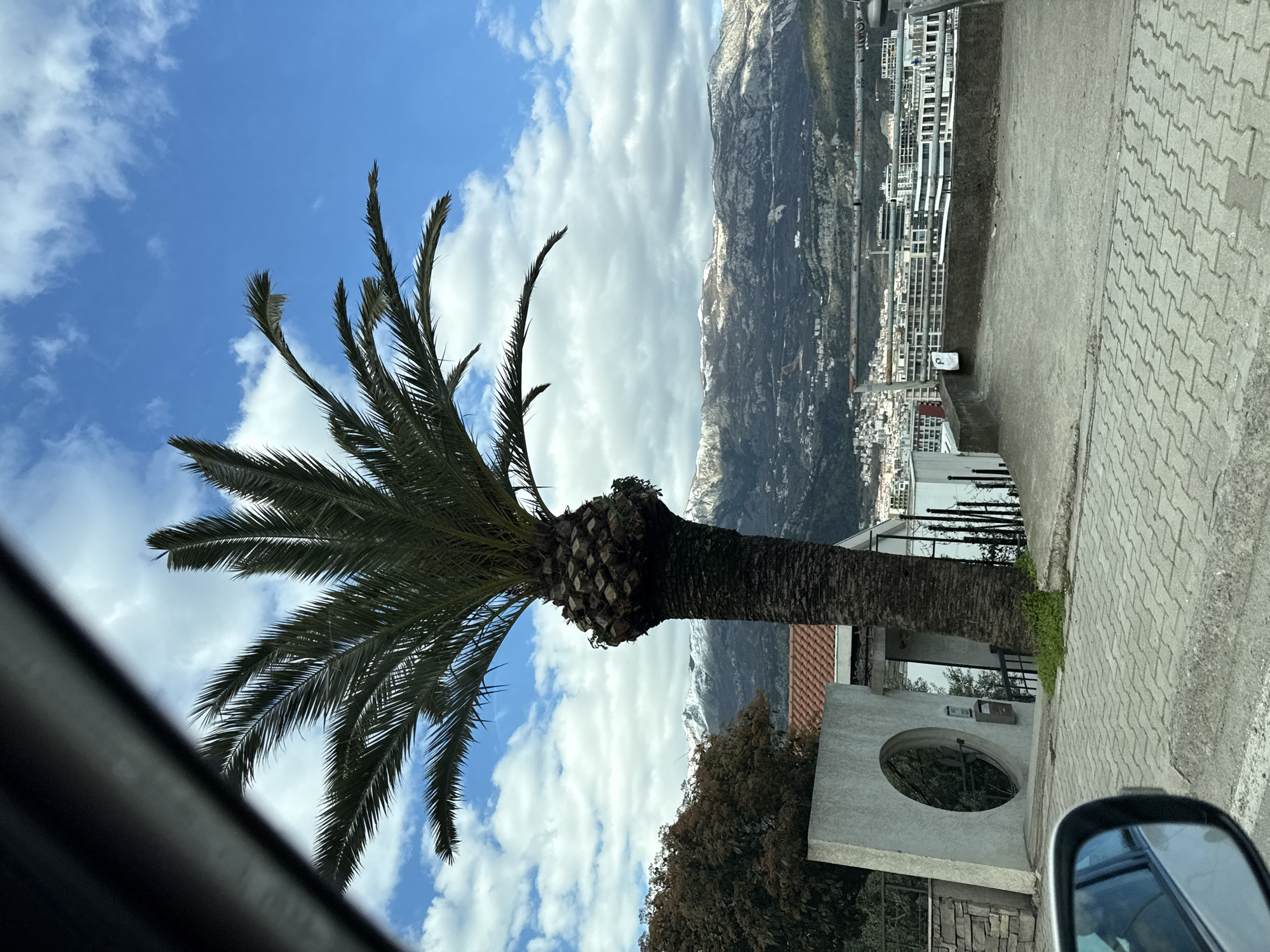 The image, taken from within a car, shows a palm tree against a backdrop of the city of Budva, Montenegro. The tree is the primary subject, featuring a thick trunk and a crown of long, green fronds extending outwards and upwards. In the distance behind the palm tree, a mountain range can be seen, its slopes partly covered in snow. The sky is blue with scattered white clouds, suggesting a sunny day. To the right of the palm tree and mountain range is a view of Budva, characterized by a dense arrangement of buildings and structures that blend into the landscape. A street with patterned brick paving is visible in the foreground. Part of the car’s interior is visible in the lower left corner, and the car’s side mirror is visible in the lower right corner. A building with a prominent circular window or opening is situated near the base of the palm tree. The overall scene captures a view of Budva that blends natural elements with the urban environment.
