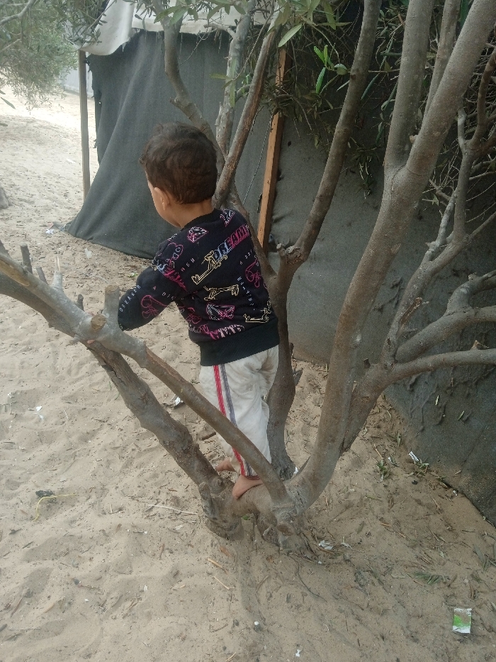 A young individual is depicted from behind, interacting with a multi-stemmed tree in a sandy outdoor environment in Al-Mawasi