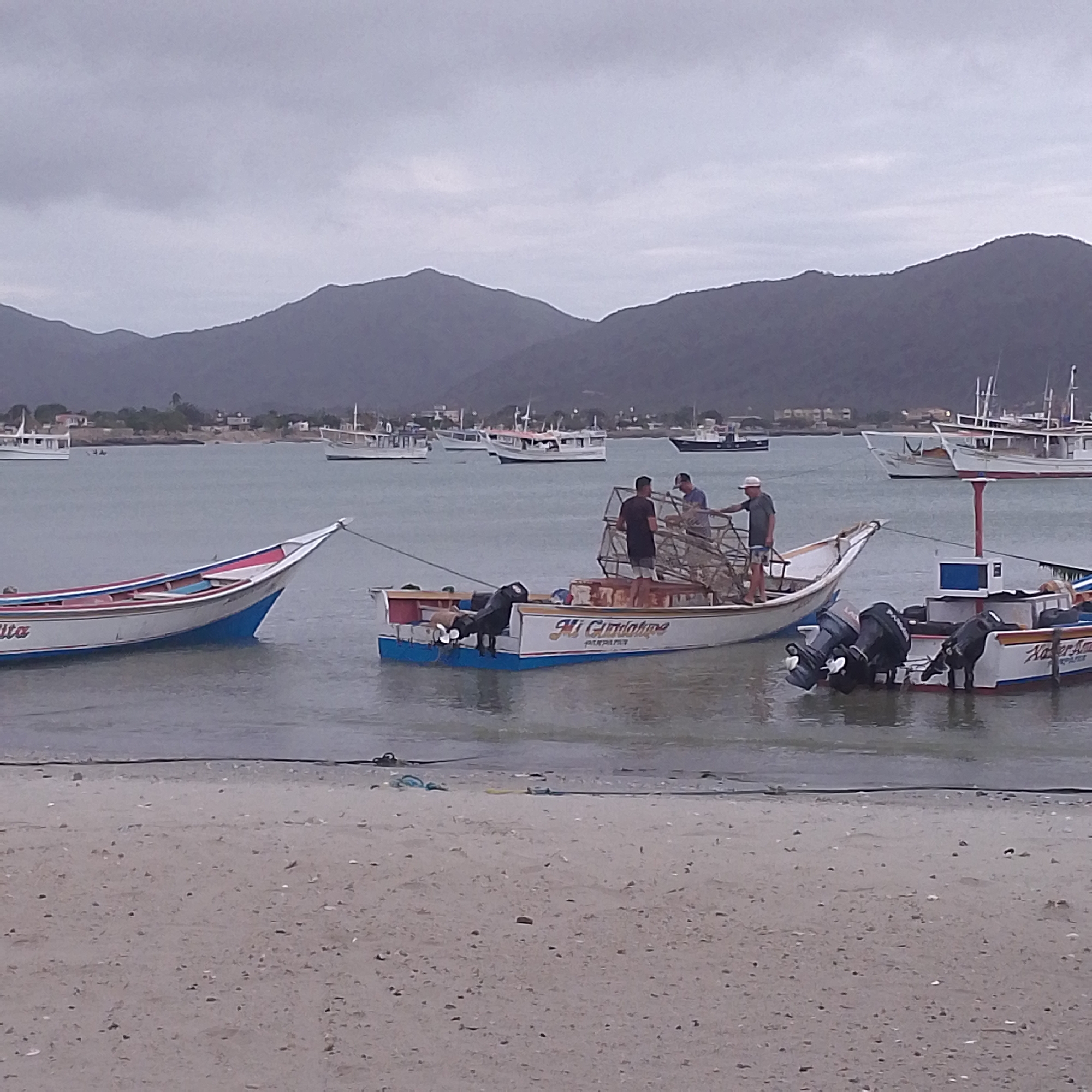 The image depicts a coastal scene in Juan Griego, Venezuela, under an overcast sky. In the foreground, a sandy beach stretches across the bottom of the frame. In the middle ground, several small boats are docked in shallow water near the shore. One boat is particularly prominent, with three men on board. They appear to be handling fishing equipment. The boat is labeled "Mi Guadalupe". Other boats are visible in the background, some docked and some further out in the water. Behind the water and boats, a range of hills or small mountains forms the horizon.