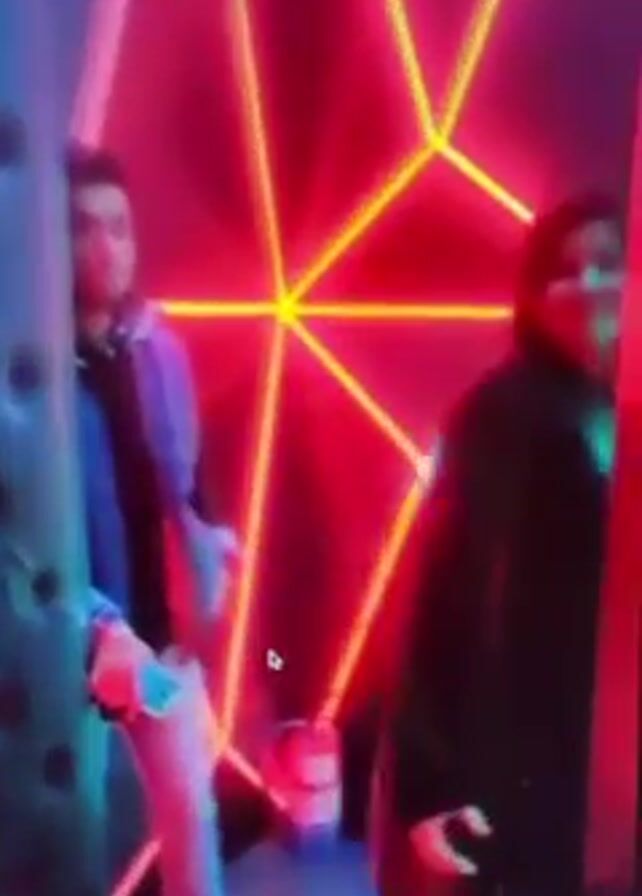group of people in what appears to be an entertainment or party setting. There is a wall display of colorful geometric lights. There is music playing in the background. People are moving around, but their faces are often obscured. The word "Halo" is visible in the top left corner of the video. At one point, the words "Halo Dinda bakteri tak" appear on the screen.