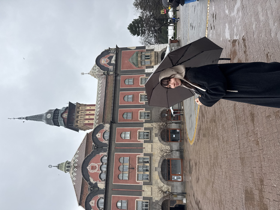 The image displays a female individual standing on a wet, reddish-brown cobblestone plaza in front of the Subotica City Hall in Subotica, Serbia, under an overcast sky. The subject is positioned in the right-center foreground, angled slightly left, looking towards the viewer with a faint smile. She has dark hair with bangs, wears a long dark coat, and a light-colored hood or balaclava with ties. She holds an open, dark-colored umbrella with both hands, positioned to her left side. In the background, the Art Nouveau architecture of the Subotica City Hall is prominent, featuring red and grey facade sections with decorative elements. A tall, central clock tower with a dark, pointed spire and a clock face rises above the main structure. The building has a distinctive roof covered with patterned red tiles, and a smaller, green-domed turret is visible on the left side. Several arched windows and ground-level arched entrances, some appearing vacant, are visible. The cobblestone ground is wet, suggesting recent rainfall. Bare trees are situated in front of the City Hall on the left. In the far right background, several indistinct figures, some holding umbrellas, are visible, along with a partial yellow McDonald's 'M' sign above a white tent-like structure. The sky is uniformly grey.