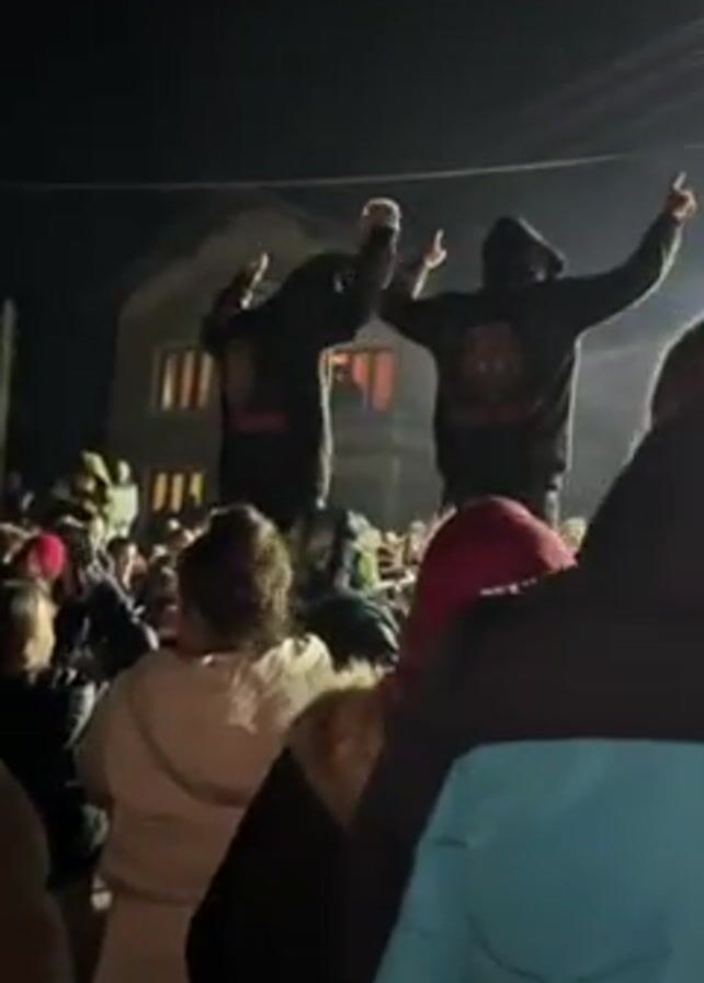 At night, a crowd of people have gathered, with some individuals standing on others' shoulders, cheering and raising their arms