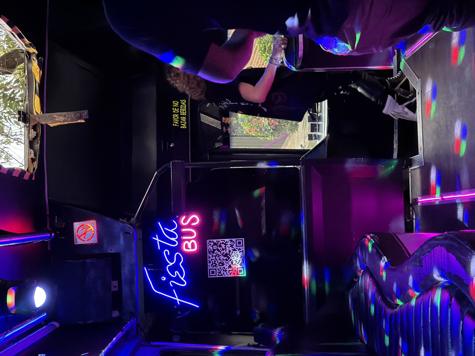 The image depicts the interior of a "Fiesta Bus" in Mexico City, Mexico