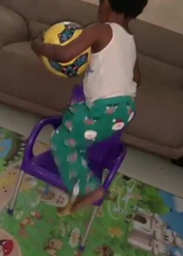 A young child, approximately four years old, is standing on a small purple plastic chair in what appears to be a living room. The child is wearing green pajamas with a Santa Claus pattern and a white tank top. The child has short, curly black hair. He is holding a yellow soccer ball with colorful details on it. The child looks at the camera and smiles and then brings his fingers to his lips in a playful manner. Behind the child, there's a beige couch. The floor has a patterned play mat. The lighting is indoor and somewhat dim.