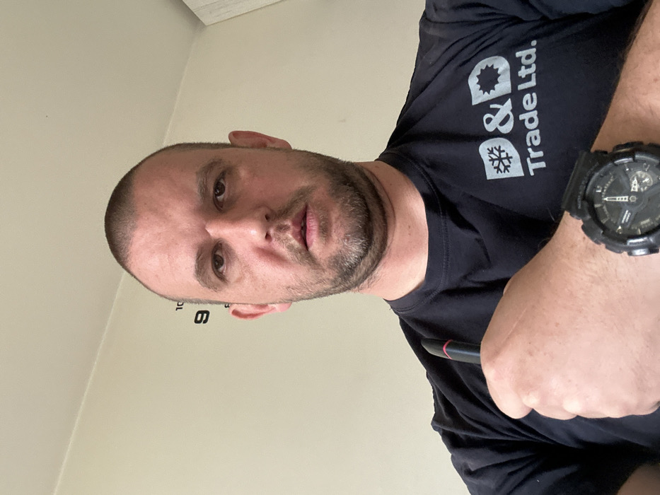 A male individual is depicted from the upper chest upwards, facing the camera directly with a neutral expression and slightly parted lips. He has short dark hair and a short dark beard or stubble. He wears a black long-sleeved shirt featuring a light grey logo on the chest that reads "D&D Trade Ltd." accompanied by a snowflake symbol and a starburst/gear-like symbol. His right hand is visible, holding a black pen with a red stripe near its tip, positioned near his right shoulder. A black digital-analog wristwatch is worn on his right wrist. The background consists of a plain, light-colored wall, with partial black numbers "9" and "10" visible vertically on the left side, suggesting a wall clock or decorative numbering. Based on the "D&D Trade Ltd." logo on the subject's shirt, the context of the image is associated with a company registered in Sofia, Bulgaria. The specific street address or internal building location within Sofia cannot be determined from the image.