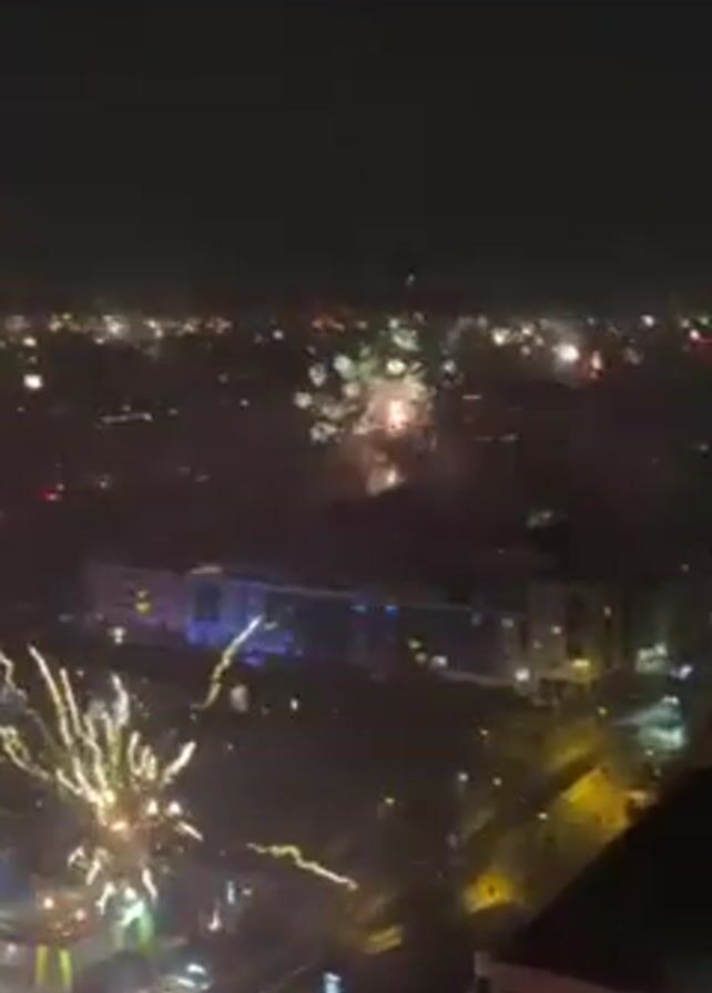 nighttime view of a city skyline filled with fireworks displays. The viewpoint is from a high vantage point, possibly a balcony or rooftop. A railing with string lights is visible in the foreground. People are seen holding up phones, presumably to record the fireworks. The environment is dark, with the city lights and fireworks illuminating the scene. The interaction involves people observing and recording the fireworks display.