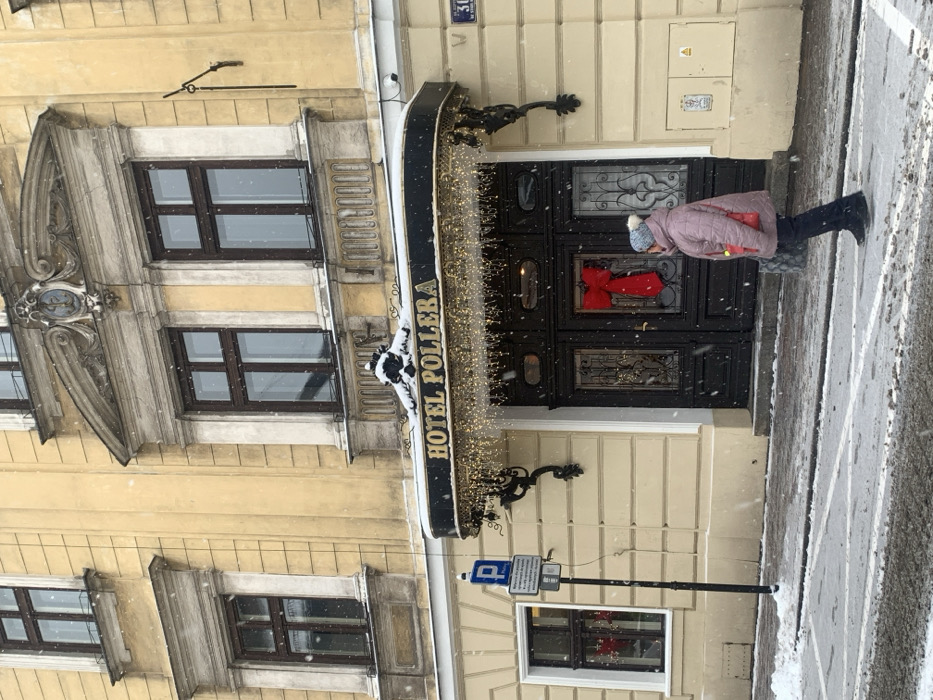 The image depicts the exterior of Hotel Pollera at ul. Floriańska 31 in Krakow, Poland, during a light snowfall. The building features a light yellow-beige facade with ornate architectural details, including decorative window frames and a pediment above the central upper windows. Snow has accumulated on ledges and decorative elements, and snowflakes are visible in the air. The hotel entrance consists of dark, ornate double doors, with a large red bow affixed to the right door. A dark awning above the entrance displays "HOTEL POLLERA" in gold lettering and is adorned with numerous small, warm-toned string lights, some partially covered by snow. To the left of the entrance, a window shows a subtle Christmas decoration. A blue 'P' parking sign with "parking płatny w strefie P" (paid parking in zone P) in white text is mounted on a black pole to the left of the hotel entrance. A white security camera is visible on the facade above the right side of the awning. The building number "31" and "ul. Floriańska" are printed on a small plaque on the far right of the facade. A single individual, dressed in a light purple/pink puffy winter coat, dark pants, dark shoes, and a light-colored beanie with a pom-pom, walks from right to left across a partially snow-covered street in the foreground. They are carrying a small red shoulder bag. The street surface shows visible white markings, possibly indicating a pedestrian crossing or parking bay, and is covered with scattered snow and slush.
