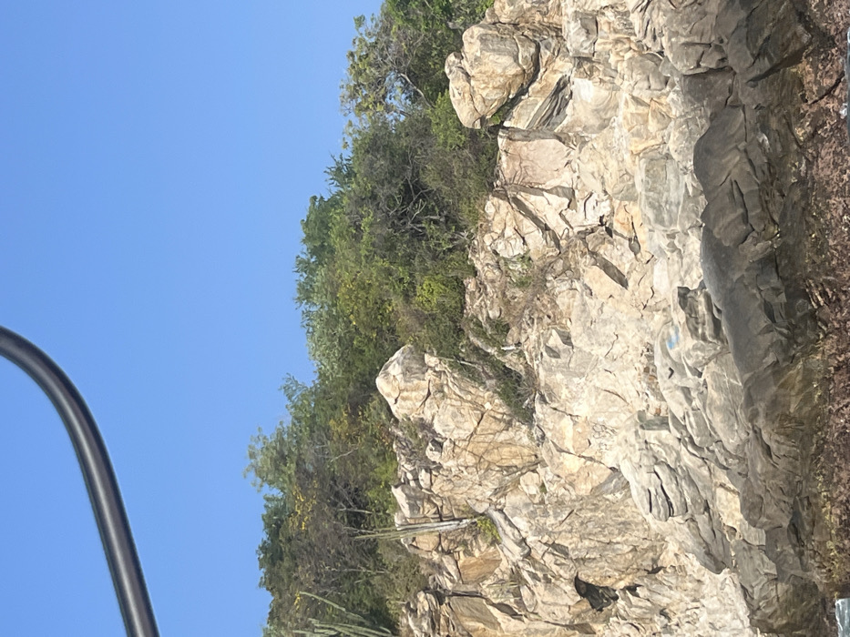 The image displays a rocky coastal bluff located in Puerto Escondido, Mexico, under a clear blue sky. The upper portion of the bluff is covered by dense, green tropical dry forest vegetation, including several columnar cacti visible on the left side. The middle and lower sections of the bluff consist of stratified, weathered rock formations, exhibiting a palette of light brown, grey, and yellowish hues with visible fractures and varied textures. Faint dark and blue markings, consistent with graffiti, are present on lighter rock surfaces in the lower-middle section. The base of the bluff meets a body of water, with dark, wet rocks visible at the waterline along the bottom edge of the frame. A dark, curved metallic or synthetic bar partially obstructs the upper left quadrant of the image, indicating the vantage point is from a vessel or structure in the immediate foreground. No people or animals are visible, and the scene is static under bright daylight.