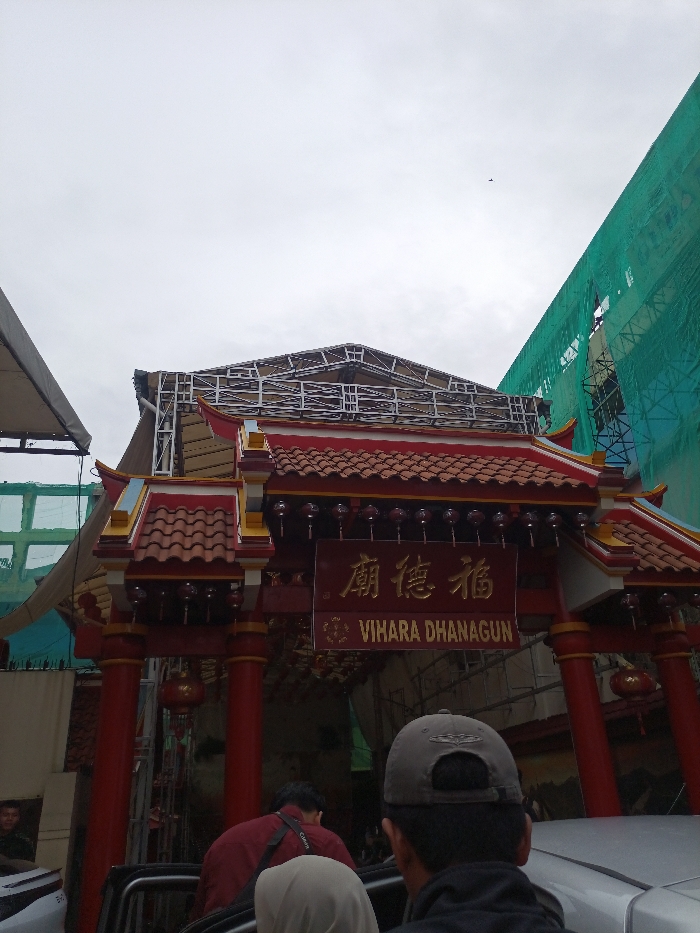 A low-angle shot focuses on the gate of Vihara Dhanagun, an ornate structure with red columns, tiled roofs, and a sign with Chinese characters. The gate is flanked by buildings under construction, one covered in green netting. People are entering or exiting the gate, their backs to the camera, with cars nearby. The sky is overcast.