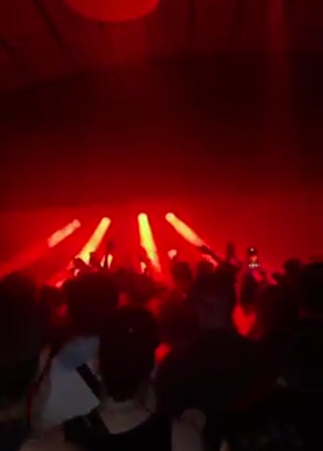 person with dark hair and fair skin at a concert or rave, with red lighting illuminating the crowd