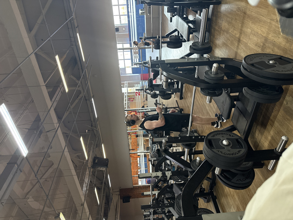 The scene depicts the interior of a fitness gym in Chaikovsky, Russia. The floor is a light brown, wood-patterned surface. The high ceiling features exposed light grey structural elements, ventilation ducts, and numerous long, rectangular fluorescent light fixtures. Several dark-colored speakers are suspended from the ceiling. In the midground, a male individual stands facing to his right. He has short hair, a dark beard, and is wearing a black sleeveless top, black shorts, and black sneakers with white soles. He wears black over-ear headphones and holds a dark-colored smartphone in his right hand, appearing to be looking at the screen. A tattoo is visible on his left forearm. He is positioned near a black weight bench press machine, which is loaded with a barbell and several black "TECHNOGYM" branded 10 kg weight plates. In the background, further to the right, a female individual is visible standing near another piece of gym equipment. She has long dark hair, wears light-colored attire, and holds a light-colored smartphone. The gym contains various other pieces of black weight training equipment, including benches, barbells, and machines, distributed across the facility. Large windows with white frames are present in the far background, allowing natural light into the space. Sections of a red brick wall are visible on the left side of the background. No direct interaction between the individuals is observed.