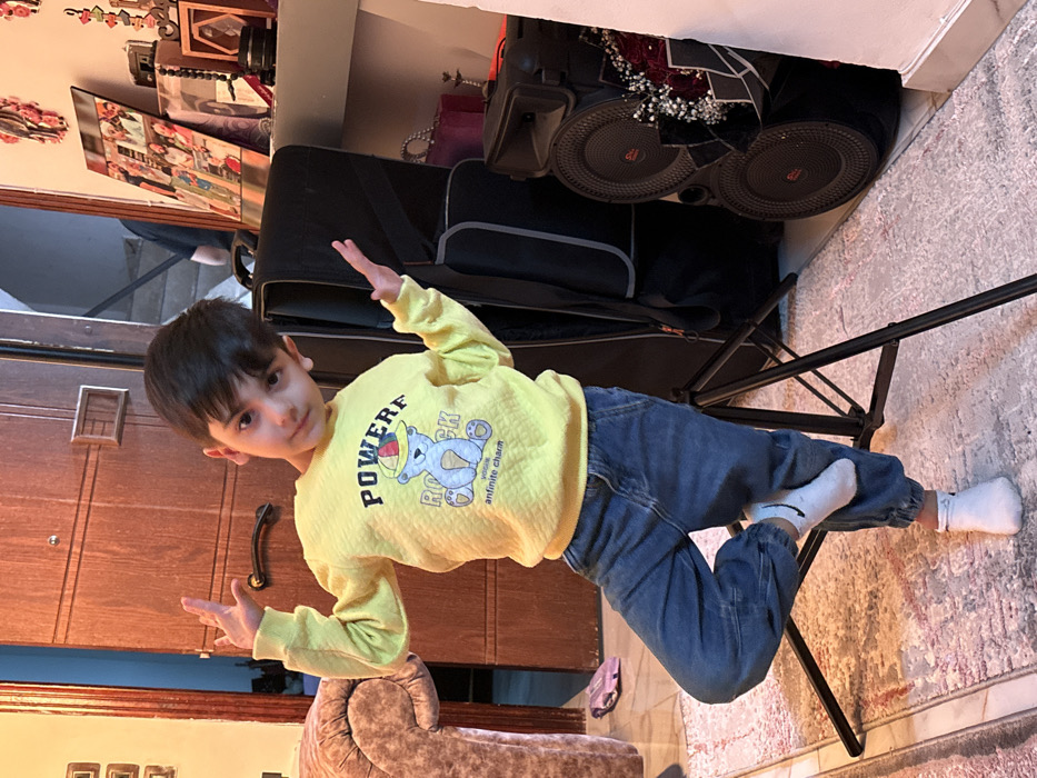 The image depicts an indoor domestic environment, assumed to be within Barza Municipality, Syria. A male child, approximately 5-7 years old with dark hair, stands centrally in a dynamic pose. He wears a yellow, quilted long-sleeved sweatshirt bearing the text "POWERF ROCK" and a graphic of a bear in a hardhat, blue denim jogger-style pants, and white ankle socks, one displaying a black Nike swoosh. His right leg is bent at the knee, with the foot resting against his left inner ankle, while his arms are raised and bent at the elbows with fingers splayed. He maintains direct eye contact with the camera. The immediate foreground reveals a light-colored, patterned area rug covering a hard floor surface, with the black metal legs of a tripod visible beneath the child. To the left, a portion of a brown, upholstered armchair is visible, followed by a dark brown wooden door equipped with a metallic handle and a rectangular decorative recess. To the right of the child, a tall, black, rectangular equipment case stands vertically. Next to the case is a dark speaker unit with two visible woofers and a port. Adjacent to the speaker, a bouquet of red roses with white accent flowers is present, wrapped in dark and gold paper. Above these items, a shelf or counter displays several framed photographs, a string of black beads, small decorative boxes, and a small hookah base. Behind these elements, a doorway opens to a stairwell, where a partial view of an individual in dark attire is visible. The scene is evenly illuminated.